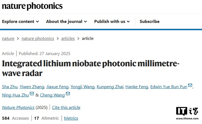IT之家查询获悉,该团队所研发的集成光子毫米波雷达芯片于 2025 年 1 月 27 日在 Nature Photonics 期刊在线发表。此项创新成果成功打破了片上光子雷达在频率与带宽上的限制,是光子雷达技术发展道路上的重要里程碑。