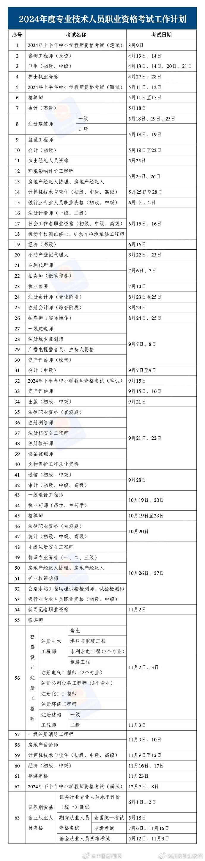 近日,人力资源社会保障部办公厅印发《关于2024年度专业技术人员职业资格考试工作计划及有关事项的通知》,明确了考试时间表。其中,2024年上半年中小学教师资格考试(笔试)是3月9日,下半年中小学教师资格考试(笔试)是9月15日。法律职业资格(客观题)是在9月21日、22日。新闻记者职业资格是在11月2日。你打算考哪个?
